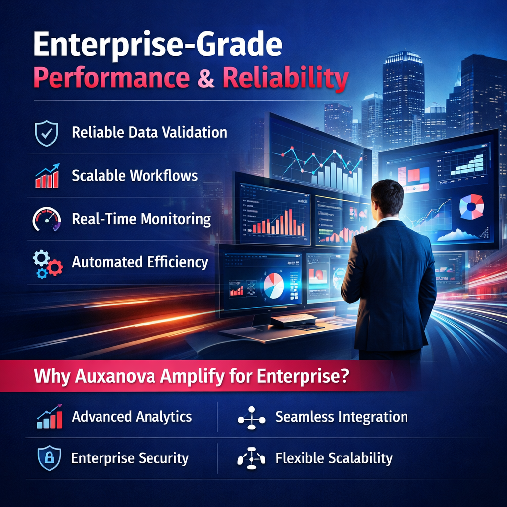 Enterprises face complex data challenges, operational bottlenecks, and the need for automation at scale. Auxanova Amplify for Enterprise empowers large organizations with streamlined data workflows, real-time analytics, and automated execution — helping you gain control, boost efficiency, and drive measurable performance across teams.