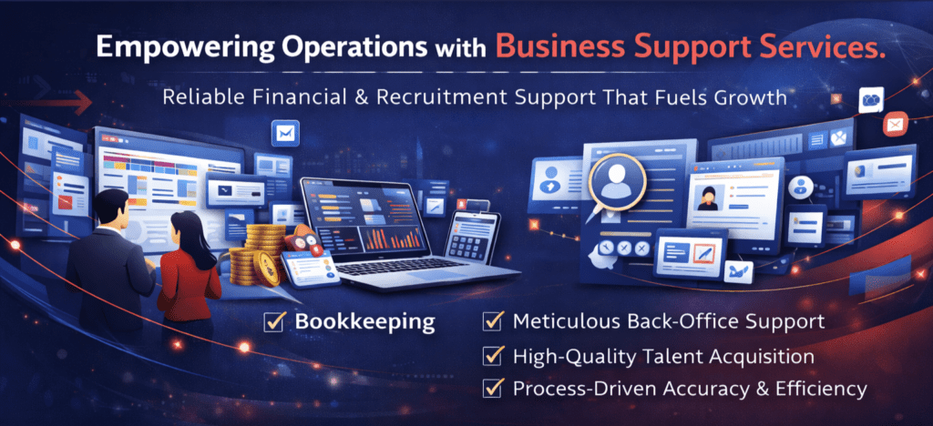 The operational foundation that businesses require to operate effectively and expand sustainably is provided by Auxanova’s Business Support Services. We assist companies in maintaining financial clarity and developing competent teams by providing organised bookkeeping and recruitment support. This ensures that day-to-day operations function smoothly while leadership concentrates on strategic priorities.